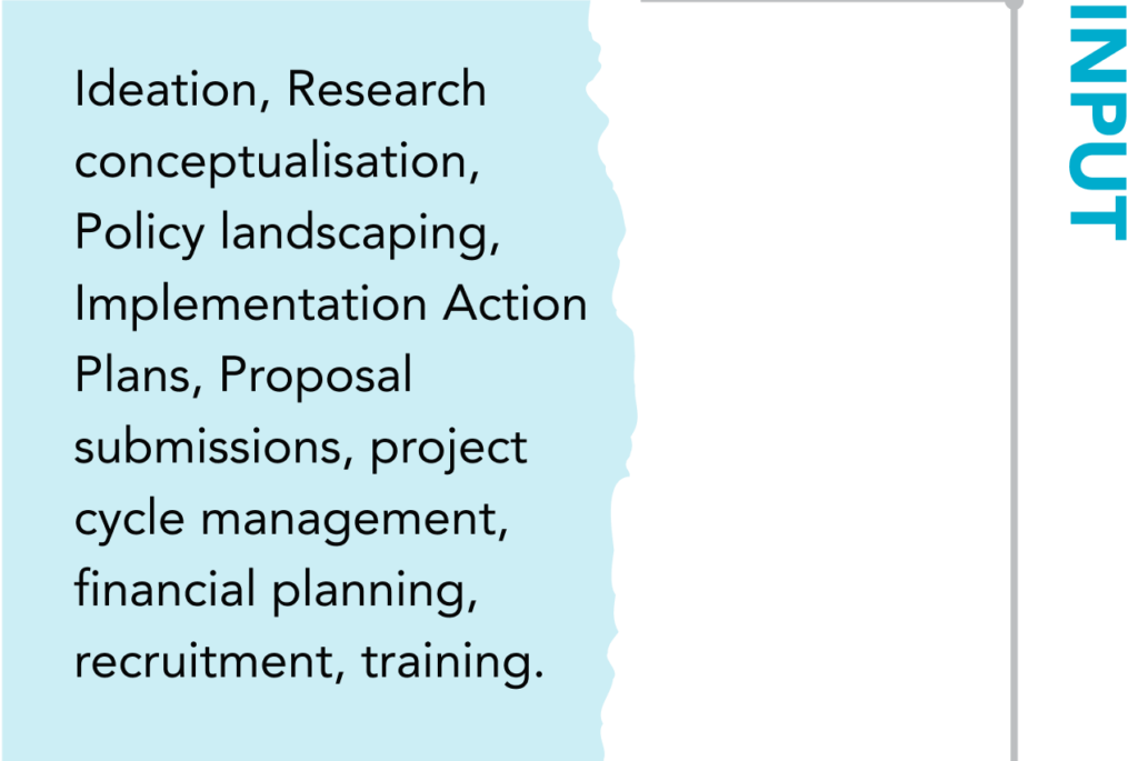Ideation, Research conceptualisation, Policy landscaping, Implementation Action Plans, Proposal submissions, project cycle management, financial planning, recruitment, training.