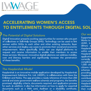 Digital innovation presents exciting opportunities for women who are part of collectives or Self Help Groups (SHGs). Technology can be used to link women within SHGs to each other and other existing l networks, and layer other services and use cases to promote their social and economic empowerment.  More specifically, SHGs can use digital platforms to request and receive information and services, so as to enable their members access these services. Moreover, innovative digital solutions can address mobility, cost and literacy barriers and significantly increase the penetration of these benefits. Haqdarshak is an innovative mobile application developed by Haqdarshak Empowerment Solutions Private Ltd (HESPL), in collaboration with Save the Children and Nokia.  The app provides a ready reference of more than 200 central and state government welfare schemes and programmes, and the benefits promised, eligibility criteria, documents required, and application process for each. The brief brings a snapshot of the model.