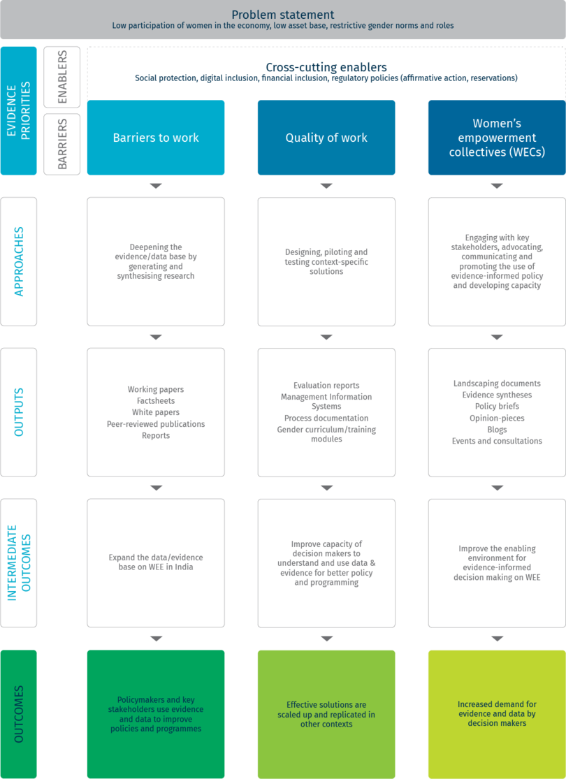 IWWAGE generates, synthesises and promotes rigorous evidence on its three thematic areas, namely, Barriers to Work, Quality of Work, and Women’s Agency, using three approaches. These include deepening of the evidence base, testing solutions, and advocating, communicating and developing the capacity of policymakers and influencers involved in accelerating Women’s Economic Empowerment (WEE).