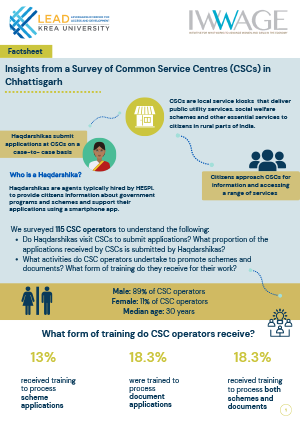 Explore key insights into the operations of Common Service Centres (CSCs) in Chhattisgarh through our latest factsheet. This document provides an in-depth analysis of the role played by Haqdarshikas, the local challenges faced by CSC operators, and the most popular government schemes and services requested by citizens. From digital inclusion to public awareness, learn how CSCs are driving access to essential services in rural areas and the impact of the Haqdarshak program. Dive into the data to understand how these centres support communities in navigating government welfare schemes and services.