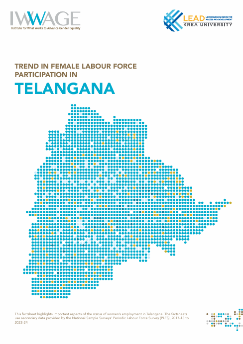 Telangana has emerged as a major industrial and services-led economy, with GSDP growing nearly 197% between 2014–15 and 2023–24. Services contribute about two-thirds of GSVA, while industry has achieved near gender parity in employment due to targeted policy interventions. Agriculture remains a key employer, engaging 45.8% of the population but contributing a smaller share to GSDP. Women are largely concentrated in agriculture, while men dominate services. This factsheet examines trends in female labour force participation in Telangana from 2017–18 to 2023–24, focusing on sectoral distribution, occupational segregation, and workforce barriers.